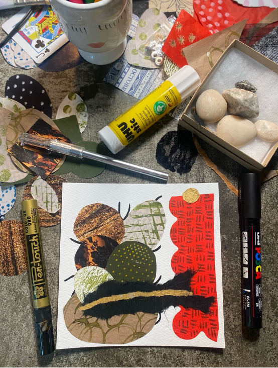 And a simple one I like is working in collage. Collage is forgiving, immediate, and gets you out of your head. For most of us writers whose identity isn’t tied to collage-making, we can play with it the way a child plays, for fun and without the pressure of outcome. All we need are simple materials (a surface, any paper and glue). Good music and a nice beverage helps, too.