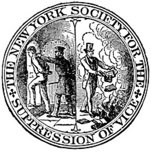 The Emblem of The New York Society for the Suppression of Vice, founded 1873. The symbol depicts a police raid on a distributor of “obscene” literature. An officer leads the distributor away while another man burns the books in question.
